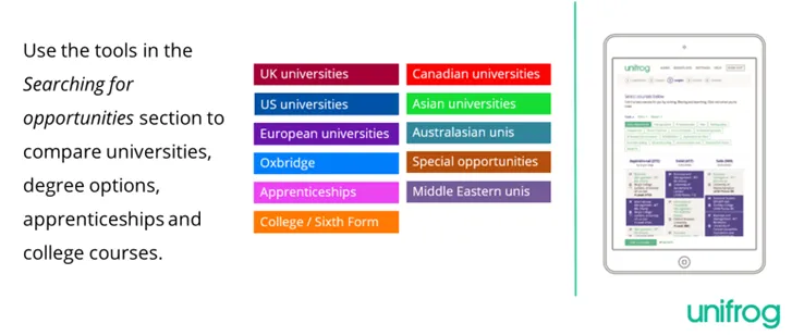 Search tools showing live vacancies/courses/placements for apprenticeships, universities (in the UK and abroad), FE, virtual work experience and much more.